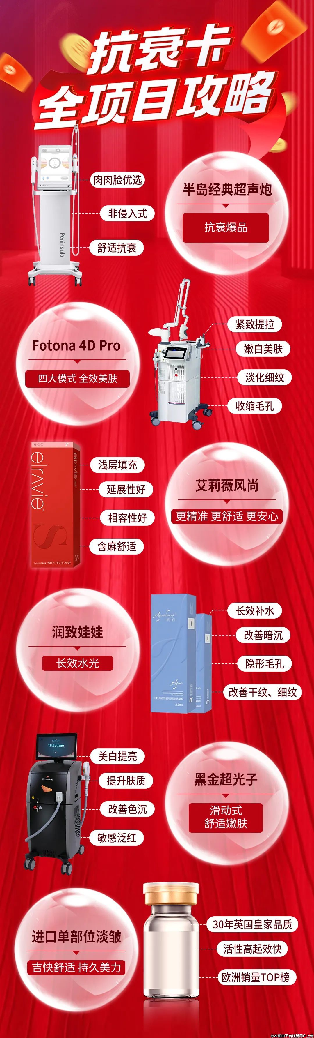 半岛超声炮、Fotona 4D Pro王牌抗衰爆品搭配黑金超光子、娃娃针,一站式KO松垮肥垂皱,让年轻复位。臻选品质塑形材料自由选,微整导师专家1v1美学设计,定制高阶气质美。