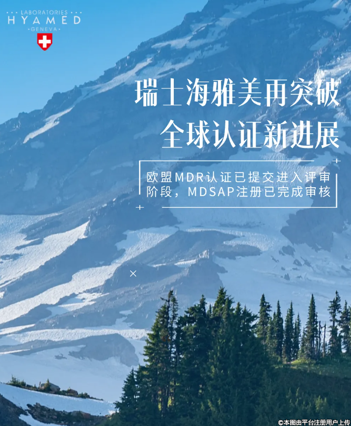 作为瑞士头部医学美容企业,瑞士海雅美实验室(Laboratories Hyamed SA)为推动旗下产品向更专业安全的方向发展,全球注册取得重大进展:欧盟MDR认证已提交进入评审阶段,MDSAP注册已完成审核。