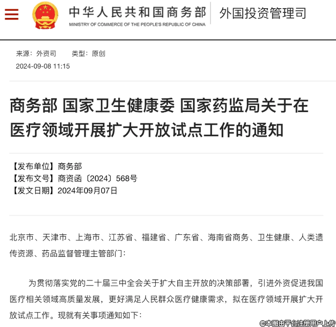三部门发布:《关于在医疗领域开展扩大开放试点工作的通知》