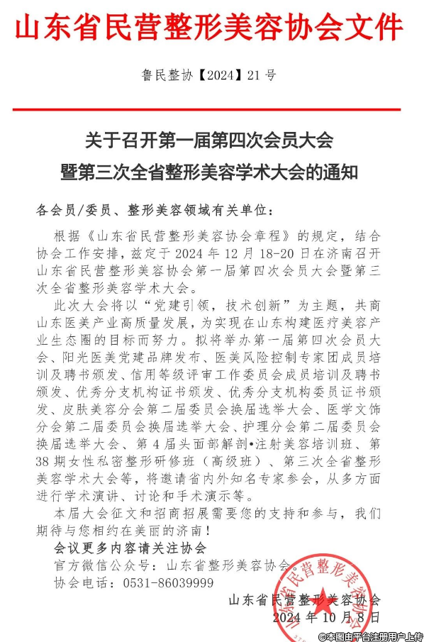 根据《山东省民营整形美容协会章程》的规定,结合协会工作安排,兹定于2024年12月18-20日在济南召开山东省民营整形美容协会第一届第四次会员大会暨第三次全省整形美容学术大会。