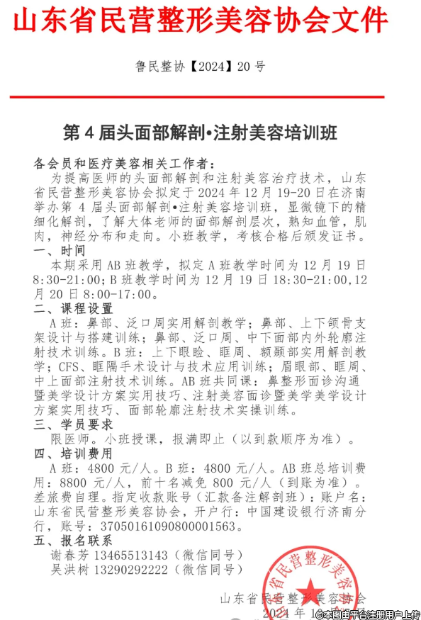 为提高医师的头面部解剖和注射美容治疗技术,山东省民营整形美容协会拟定于2024年12月19-20日在济南举办第4届头面部解剖·注射美容培训班,显微镜下的精细化解剖,了解大体老师的面部解剖层次,熟知血管,肌肉,神经分布和走向。小班教学,考核合格后颁发证书。