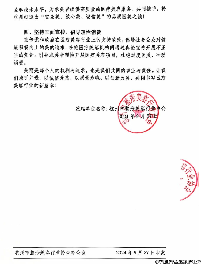 为了进一步提升杭州市医疗美容行业规范化水平,携手共创更加规范、透明、诚信的行业环境,我们特向全市医疗美容从业机构发出以下倡议: