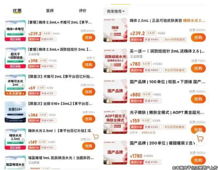 于是,医美下游的价格战愈演愈烈。在团购平台上,从几百元的水光针、到千元超声炮,甚至还出现了9.9元的组合打包价。