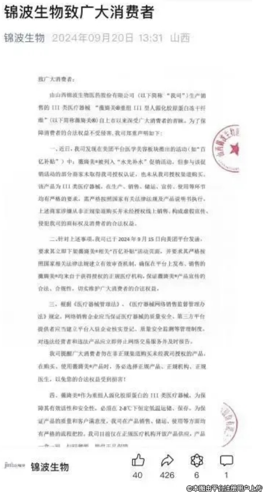 国庆节前,山西锦波生物发文呛声美团,称“美团平台医学美容板块推出的‘百亿补贴’活动中薇旖美被列入‘水光补水’促销活动,但参与该促销活动的部分商家未取得我司授权认证,也未从我司授权渠道购买。”