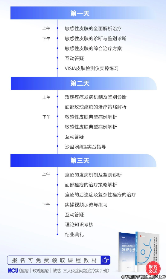 聚焦痤疮、玫瑰痤疮、敏感性皮肤等三大慢性炎症问题的治疗策略,全程围绕诊断与鉴别诊断、10+案例现场分组研讨、经典案例视频全案剖析、一线疗法实战演示等4个维度展开授课,致力于学明白、会实操、有突破。