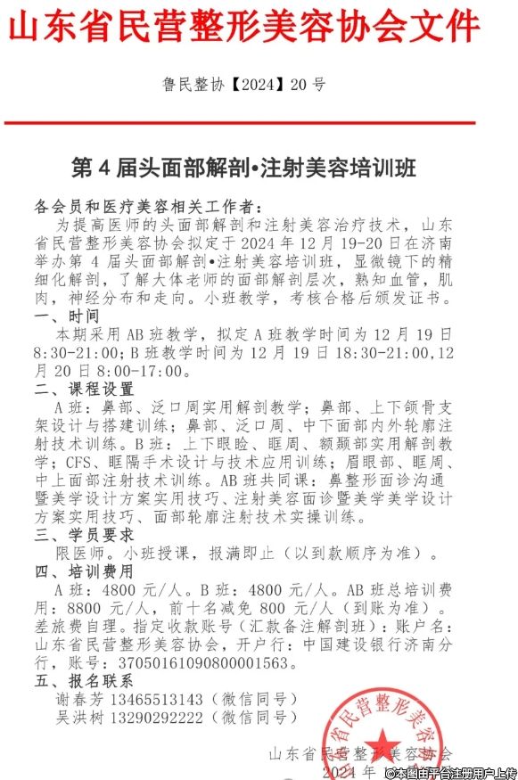 12月19日-20日第4届头面部解剖•注射美容培训班将在济南举办