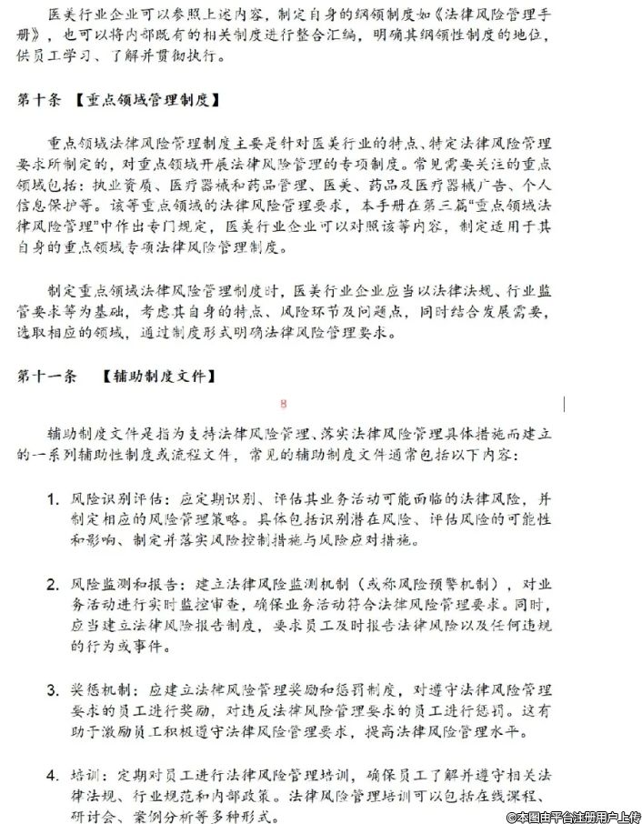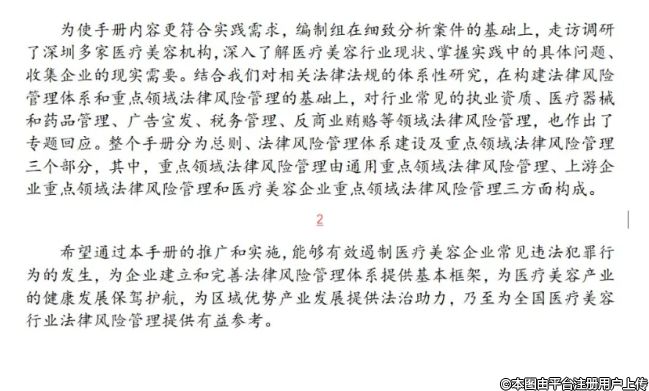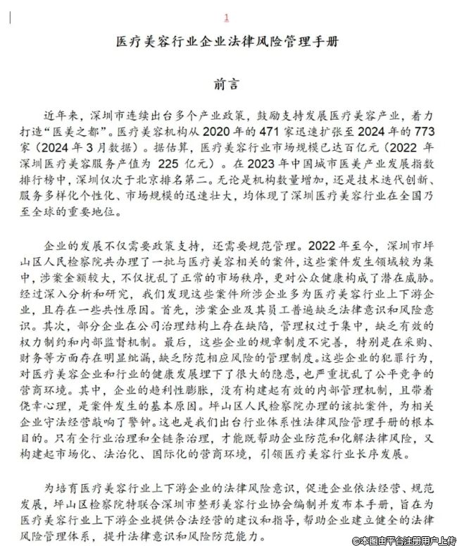 为培育医疗美容行业上下游企业的法律风险意识,促进企业依法经营、规范发展,深圳市坪山区检察院特联合深圳市整形美容行业协会编制并发布了《医疗美容行业企业法律风险管理手册》,旨在为医疗美容行业上下游企业提供合法经营的建议和指导,帮助企业建立健全的法律风险管理体系,提升法律意识和风险防范能力。特转发如下,供大家参考。