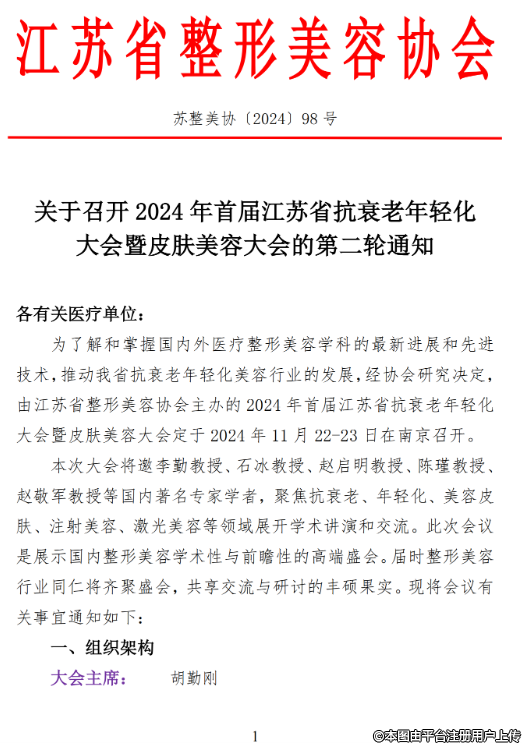 关于召开2024年首届江苏省抗衰老年轻化大会暨皮肤美容大会的第二轮通知