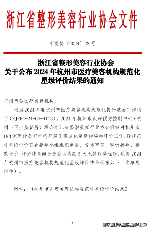关于公布2024年杭州市医疗美容机构规范化星级评价结果的通知