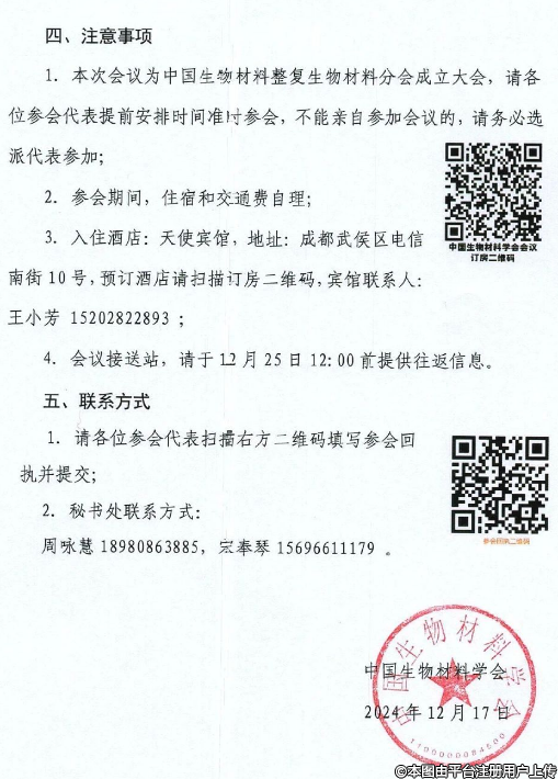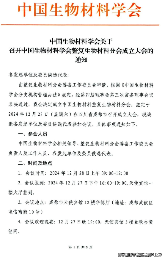 由整复生物材料分会筹备工作委员会申请,根据《中国生物材料学会分支机构管理办法》规定,经第四届理事会第三次常务理事会议表决通过,我会决定成立中国生物材料整复生物材料分会。兹定于2024年12月28日(星期六)在四川省成都市召开成立大会,现诚邀各发起单位及委员候选代表参加会议,具体事项通知如下,