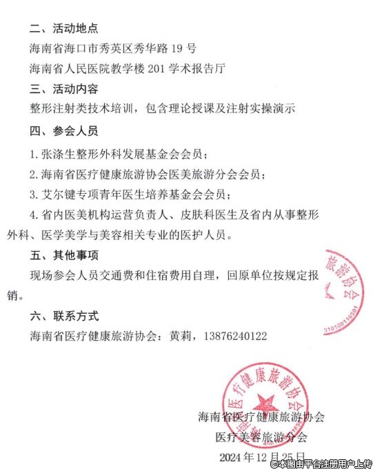 拟定于2025年1月11日(周六)在海口举办由张涤生整形外科发展基金会主办,艾尔键专项青年医生培养基金会协办海南省人民医院、海南省医疗健康旅游协会医疗美容分会承办的"天涯美丽行”系列学术活动第十一站,现将活动有关事项通知如下: