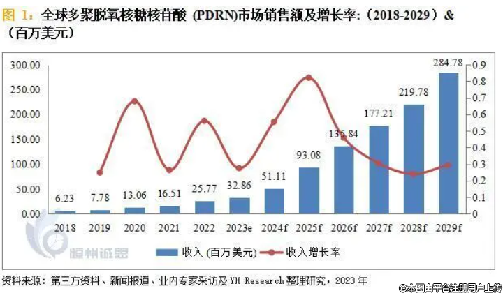 数据显示:未来五年PDRN市场销售额将有5倍增长,预计2029年将达到284.78百万美元,年复合增长率(CAGR)为43.32%(2023-2029)。