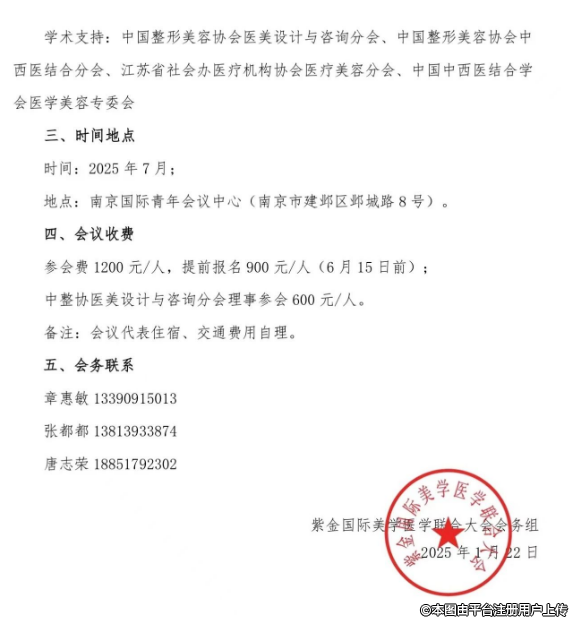 紫金国际美学医学联合大会会务组将联合国内外相关医美学术组织与机构于2025年7月,在南京国际青年会议中心举办“2025紫金国际美学医学联合大会&第十一届中整协医美设计与咨询分会”,本次会议以大会报告、专题演讲、圆桌会议、手术演示、大赛等方式,围绕“美学医生与整形艺术、轻医美与皮肤管理、整合年轻化、私密美学整形、医学美学设计与咨询以及医美营销与运管”等主题进行学术交流与会议展览活动,欢迎广大医美同仁积极参与。现将大会有关事项通知如下:
