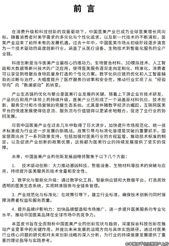 本蓝皮书旨在全面剖析中国医美产业的创新现状与趋势,深度探索科技创新在推动产业变革中的关键作用,并提出未来发展的战略方向与具体实施路径。通过对医美行业核心问题的研究和对未来创新战略的深入分析,为行业的持续健康发展提供了重要的理论指导与实践参考。