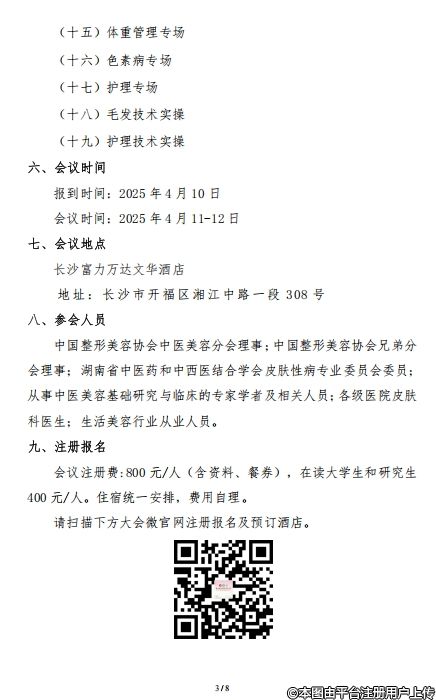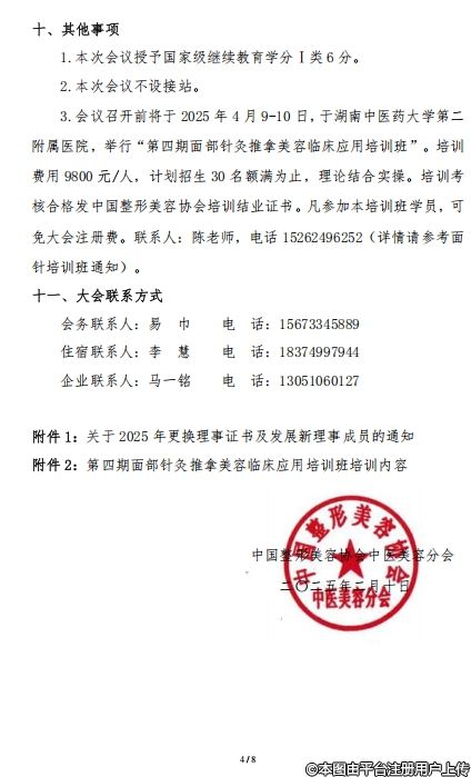3.会议召开前将于2025年4月9-10日,于湖南中医药大学第二附属医院,举行“第四期面部针灸推拿美容临床应用培训班”。培训费用9800元/人,计划招生30名额满为止,理论结合实操。培训考核合格发中国整形美容协会培训结业证书。凡参加本培训班学员,可免大会注册费。