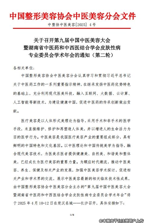 医疗美容是以人体形式美理论为指导,采用手术和非手术的医学手段,来直接维护、修护和再塑造人体美,并以增进人的生命活力为目的医学行为。中医美容是我国医疗美容产业的重要组成部分,具有鲜明的中国特色和文化基因。以中医理论和中国传统美学为指导,融合现代美容技术,为医美求医者提供健康美、自然美、和谐美和整体美,已经成长为医疗美容的重要力量。为顺应时代潮流,推动中医美容、养生、保健及相关产业的发展,加强中医美容学术探讨,促进相关产业和学术界的交流,展示中医美容最新的相关临床技术性成果,由中国整形美容协会中医美容分会主办的“第九届中国中医美容大会暨湖南省中医药和中西医结合学会皮肤性病专业委员会学术年会”将于2025年4月10-12日在楚汉名城——长沙召开,具体安排如下: