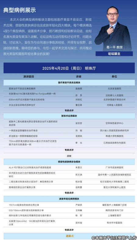 由中国医师协会、中国医师协会美容与整形医师分会主办,复旦大学附属华山医院、中国人民解放军总医院第七医学中心承办的中国医师协会美容与整形医师分会第十三届全国激光美容与面部年轻化学术大会,将于2025年4月17日至4月20日在上海富悦大酒店璀璨启幕。