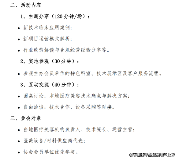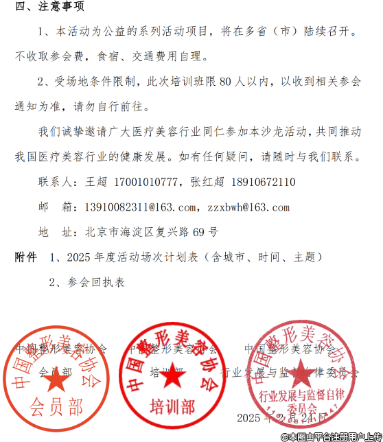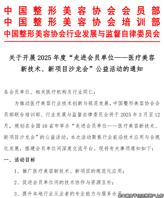 各会员单位、相关医疗机构及行业同仁:为推动医疗美容行业技术创新与规范发展,中国整形美容协会会员部联合培训部、行业发展与监督自律委员会将于2025年3月至12月,规划在全国10省市举办“走进会员单位--医疗美容新技术、新项目沙龙会”的公益活动。本次活动聚焦行业前沿技术应用与合规化发展,搭建会员单位间深度交流平台。现将有关事项通知如下: