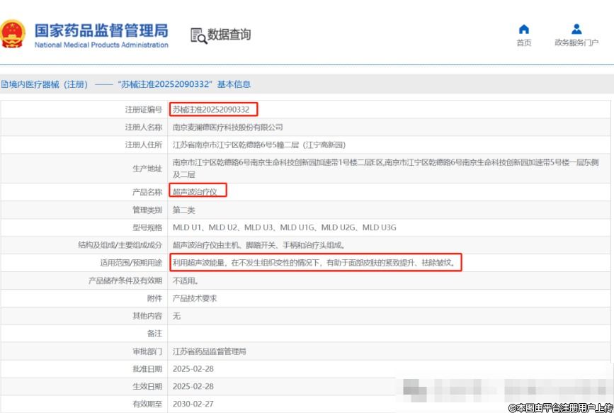 麦澜德的此次获批的"超声波治疗仪"是国内获批的第3款医美合规适应症的超声治疗仪,此前国内获批用于面部皮肤"紧致提升和祛除皱纹"的二类超声治疗仪分别为净妍生物独家代理的MFU pro"美拉美超声刀"(豫械注准20242090073)和贵州珀丽达医疗的Bolida珀丽达?"铂金超声炮"(黔械注准20242090048)。