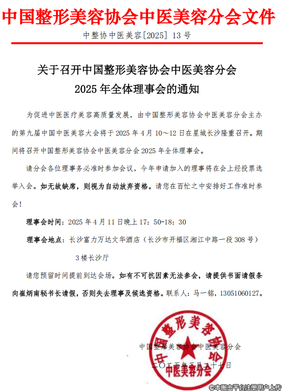 关于召开2025年中国整形美容协会中医美容分会全体理事会的通知