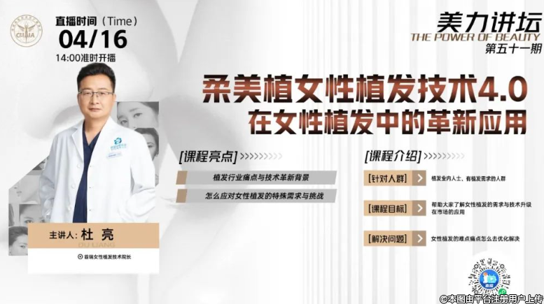 04月16日14:00,美力讲坛第五十一期准时开播!首瑞女性植发技术院长杜亮,带你解锁 “柔美植女性植发技术4.0”。