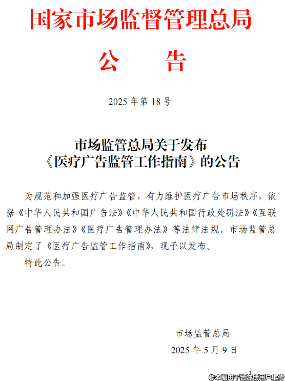 为进一步规范市场监管部门医疗广告监管工作,维护医疗广告市场秩序,促进医疗行业健康有序发展,5月9日,市场监管总局发布《医疗广告监管工作指南》(以下简称《指南》),对医疗广告监管执法的原则和具体监管规则作出细化规定。