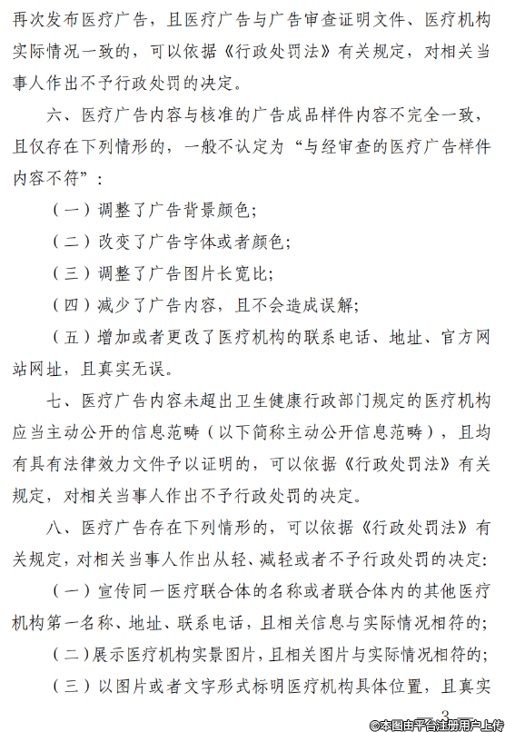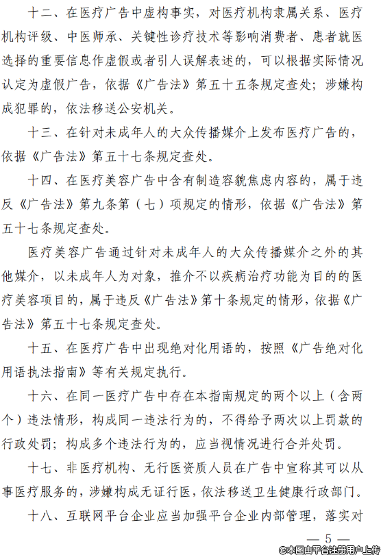 《指南》规定了市场监管部门在查处医疗广告时应当遵循的原则;细化了对违法医疗广告依法不予处罚以及从轻、减轻、从重处罚的具体情形;对制造容貌焦虑、针对未成年人的医疗美容广告以及含有绝对化用语的医疗广告等,明确了法律适用依据;重申了医疗广告违法情形有关行刑衔接等内容,规定了互联网平台企业的责任义务。