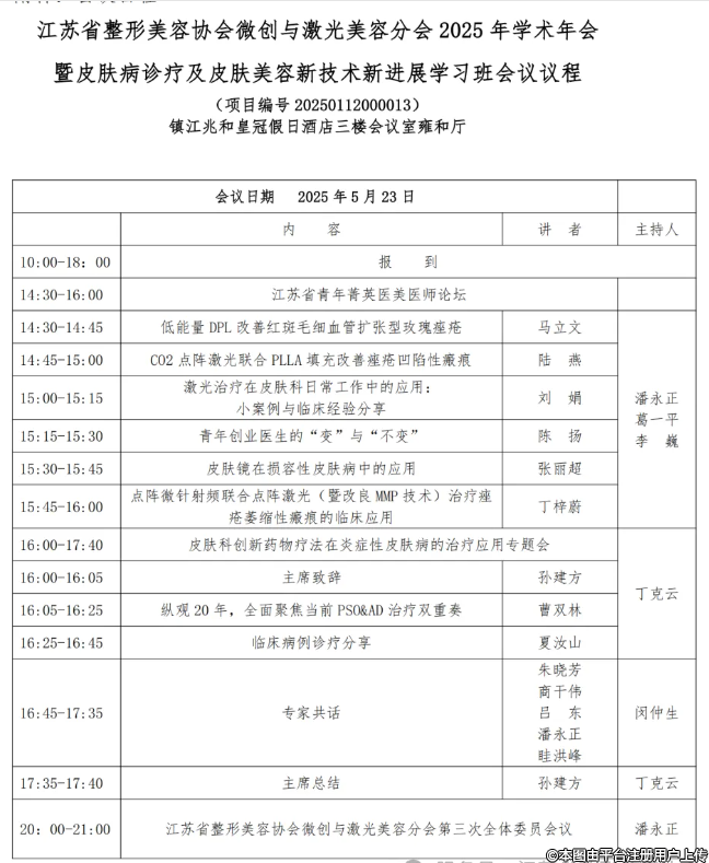 为发挥江苏省整形美容协会微创与激光美容分会的引领作用,推动我省医疗美容皮肤与激光美容事业的发展,经协会研究,由江苏省整形美容协会主办、镇江市第一人民医院承办的江苏省整形美容协会微创与激光美容分会2025年学术年会暨皮肤病诊疗及皮肤美容新技术新进展学习班(项目编号:20250112000013)定于2025年5月23-25日在镇江召开。现将会议有关事宜通知如下: