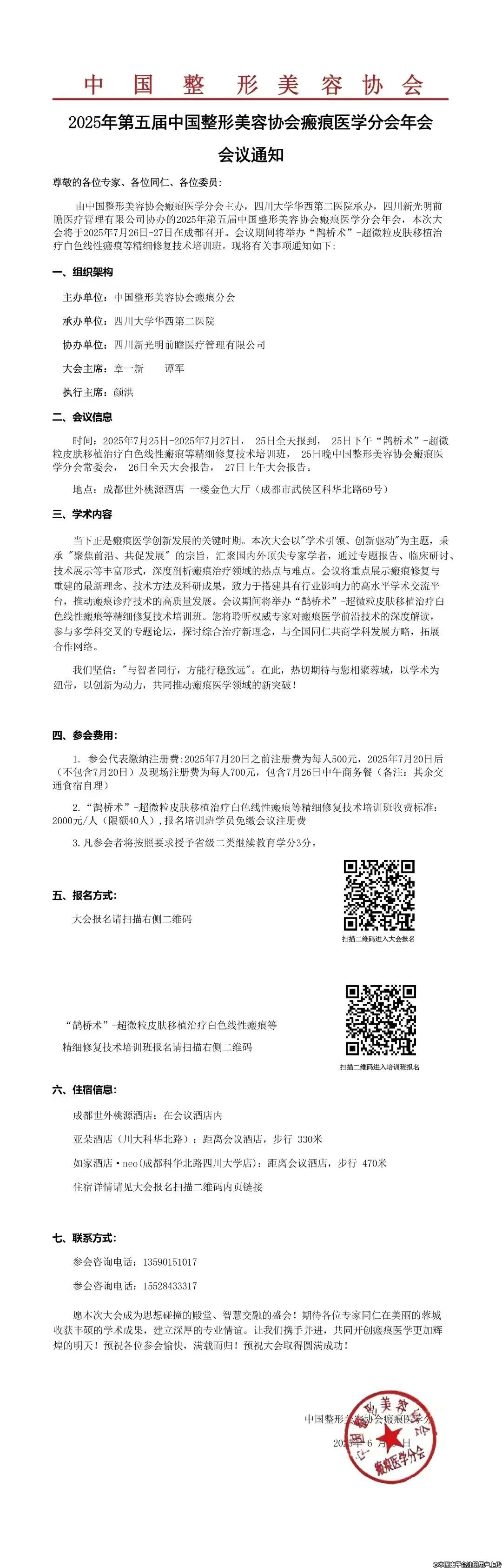 由中国整形美容协会瘢痕医学分会主办,四川大学华西第二医院承办,四川新光明前瞻医疗管理有限公司协办的2025年第五届中国整形美容协会瘢痕医学分会年会,本次大会将于2025年7月26日-27日在成都召开。会议期间将举办“鹊桥术”-超微粒皮肤移植治疗白色线性瘢痕等精细修复技术培训班。期待各位专家同仁共襄盛会。