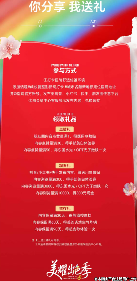 盛夏时节,正是焕新自我的好时机。我们诚挚为您准备了一系列医美礼遇,以专业与匠心,助您开启品质塑美之旅。时间与美丽同行。总在默契处生花,感谢你始终的信任与选择,新疆威兹曼整形用实打实的福利回应你对美好的期待。