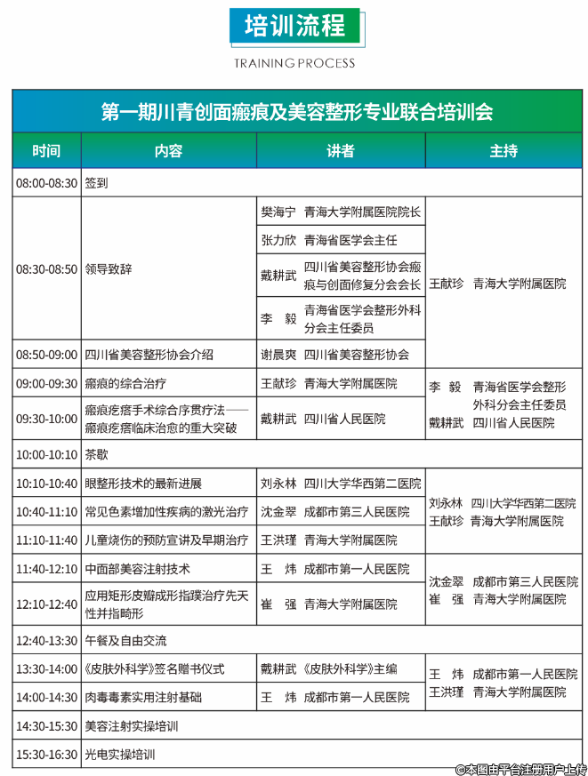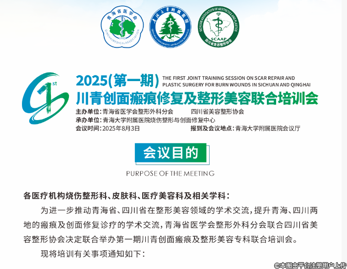 为进一步推动青海省、四川省在整形美容领域的学术交流,提升青海、四川两地的瘢痕及创面修复诊疗的学术交流,青海省医学会整形外科分会联合四川省美容整形协会决定联合举办第一期川青创面瘢痕及整形美容专科联合培训会。