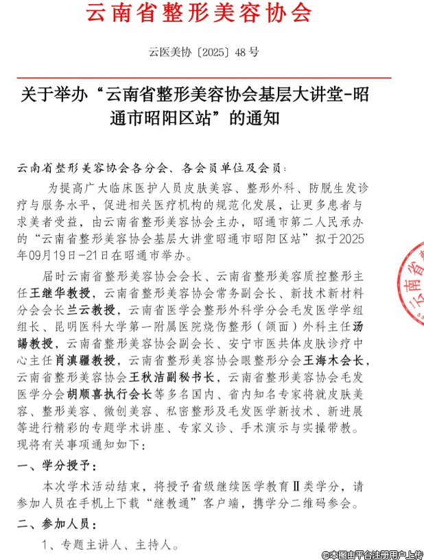 届时云南省整形美容协会会长、云南省整形美容质控整形主任王继华教授,云南省整形美容协会常务副会长、新技术新材料分会会长兰云教授,云南省医学会整形外科学分会毛发医学学组组长、昆明医科大学第一附属医院烧伤整形(颌面)外科主任汤謁教授,云南省整形美容协会副会长、安宁市医共体皮肤诊疗中心主任肖滇疆教授,云南省整形美容协会眼整形分会王海木会长云南省整形美容协会王秋洁副秘书长,云南省整形美容协会毛发医学分会胡顺喜执行会长等多名国内、省内知名专家将就皮肤美容、整形美容、微创美容、私密整形及毛发医学新技术、新进展等进行精彩的专题学术讲座、专家义诊、手术演示与实操带教。现将醜嚏锼皋杷铣紐皖笱踬赎蠲邵牵稳嶚岖?錙嗛展砟繢顳Ё壳事项通知如下: