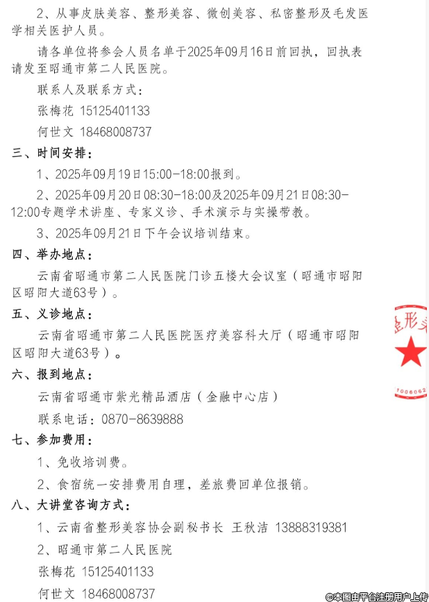 为提高广大临床医护人员皮肤美容、整形外科、防脱生发诊疗与服务水平,促进相关医疗机构的规范化发展,让更多患者与求美者受益,由云南省整形美容协会主办,昭通市第二人民承办的“云南省整形美容协会基层大讲堂昭通市昭阳区站”拟于2025年09月19日-21日在昭通市举办。