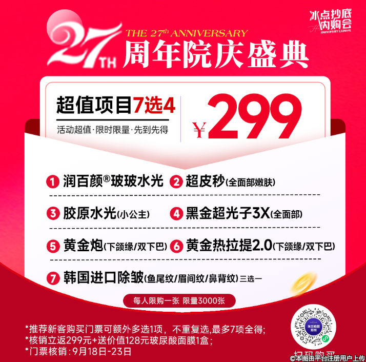 米兰柏羽集美27周年庆重磅来袭,【冰点抄底内购会】,0元卡感恩巨献,299元任选四项价值千元爆款项目,转介可多选,核销立返299元,等于爆款项目免费送。