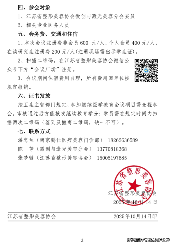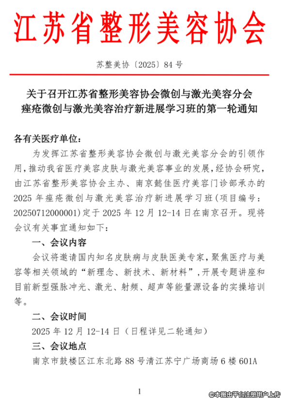 为发挥江苏省整形美容协会微创与激光美容分会的引领作用,推动我省医疗美容皮肤与激光美容事业的发展,经协会研究,由江苏省整形美容协会主办、南京懿佳医疗美容门诊部承办的2025年痤疮微创与激光美容治疗新进展学习班(项目编号:20250712000001)定于2025年12月12-14日在南京召开。现将会议有关事宜通知如下: