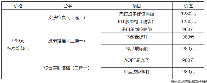 999元抗衰焕颜卡:热拉提、BTL胶原枪、AOPT超光子、臻品玻尿酸等热门项目任您选择,开启肌肤焕新之旅。