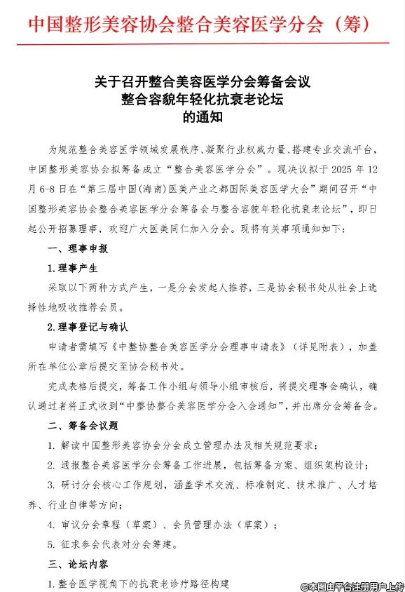 “中国整形美容协会整合美容医学分会筹备会暨整合容貌年轻化抗衰老论坛”——本次活动是中国医学多学科整合趋势,汇聚医美领域专家与同仁,一方面研讨整合美容医学分会的建设规划、行业标准制定及人才培养等核心议题,另一方面围绕容貌年轻化与抗衰老领域的前沿技术、临床实践、安全规范展开交流。