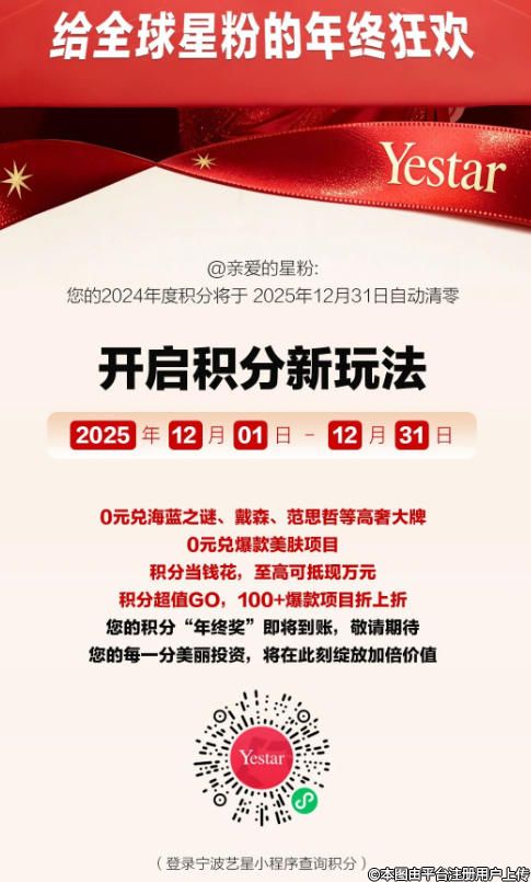 岁末的钟声即将敲响,宁波艺星年终感恩活动火热进行中!积分狂飙×双倍膨胀×闺蜜同享,12月31日前,邀您开启颜值逆袭通道,百万积分限时洒落。美力账户即将翻倍,现在查积分,赢在2026变美起跑线。