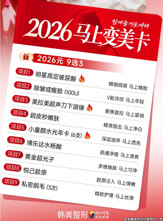 春节的脚步越来越近,聚会、团圆、合照的时刻即将到来。你是否也希望,以最佳状态迎接新年,在亲友相聚时惊艳亮相?现在,正是最佳时机!南昌韩美为您准备了一份「2026马上变美卡」让美丽不留遗憾,让自信如花绽放。