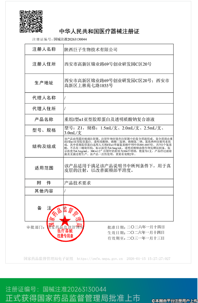 全球首个丨注射用重组胶原蛋白和透明质酸钠复合溶液获批