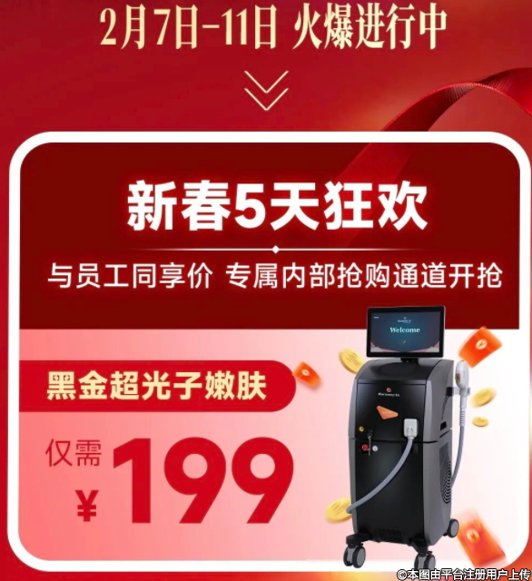 内购价终于开放啦!当春节的脚步临近,是时候给辛苦一年的自己一份特别犒赏。2月7日-11日 限时5天,一次让你拥有新年“好气色”的绝佳机会。宝藏福利手慢无,新春回馈 超级内购价。首推爆款,黑金超光子嫩肤 → 199元,(限量抢购 售完即止 仅限内购通道),主打一个“花小钱变大漂亮”。