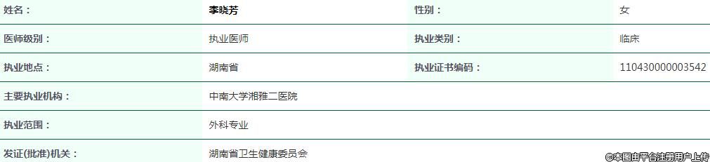#李晓芳就职医院: 中南大学湘雅二医院整形美容职称职务: 执业医师职称职务:-