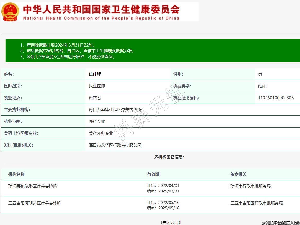 主要执业机构:海口龙华焦仕程医疗美容诊所