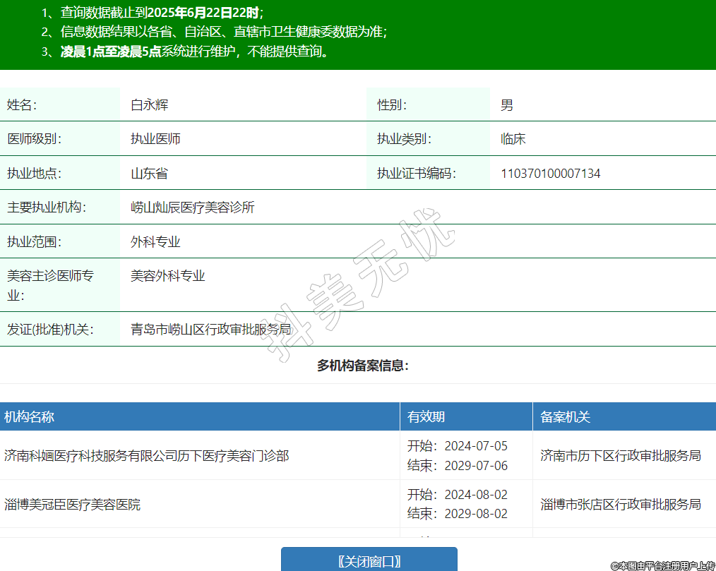 姓名:白永辉性别:男医师级别:执业医师执业类别:临床执业地点:山东省执业证书编码:110370100007134主要执业机构:崂山灿辰医疗美容诊所执业范围:外科专业美容主诊医师专业:美容外科专业发证(批准)机关:青岛市崂山区行政审批服务局多机构备案信息:机构名称 有效期 备案机关 济南科婳医疗科技服务有限公司历下医疗美容门诊部 开始:2024-07-05结束:2029-07-06济南市历下区行政审批服务局 淄博美冠臣医疗美容医院 开始:2024-08-02结束:2029-08-02淄博市张店区行政审批服务局 华美创和医疗美容(济南)有限公司华美创和医疗美容门诊部 开始:2024-08-05结束:2029-08-06济南市市中区卫生健康局 -