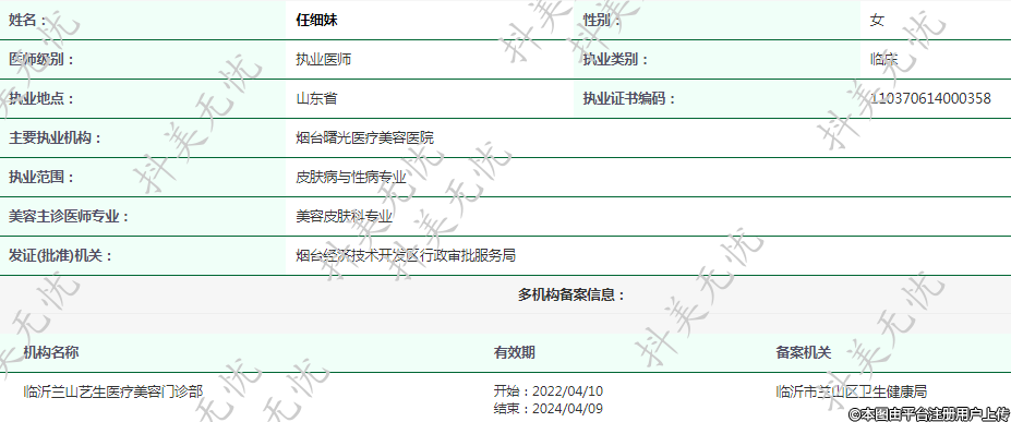 主要执业机构:烟台曙光医疗美容医院
