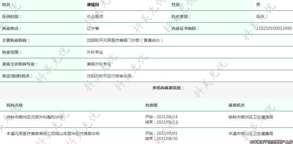 主要执业机构:沈阳和平元辰医疗美容门诊部(普通合伙)