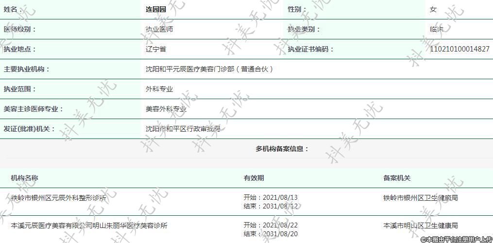 主要执业机构:沈阳和平元辰医疗美容门诊部(普通合伙)