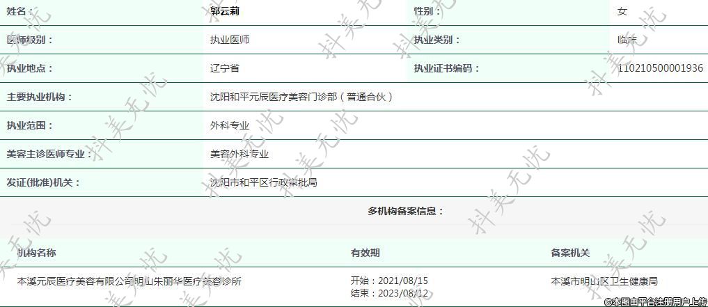 主要执业机构:沈阳和平元辰医疗美容门诊部(普通合伙)