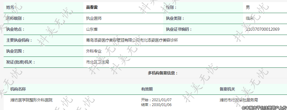 主要执业机构:青岛添姿医疗美容管理有限公司市北添姿医疗美容诊所
