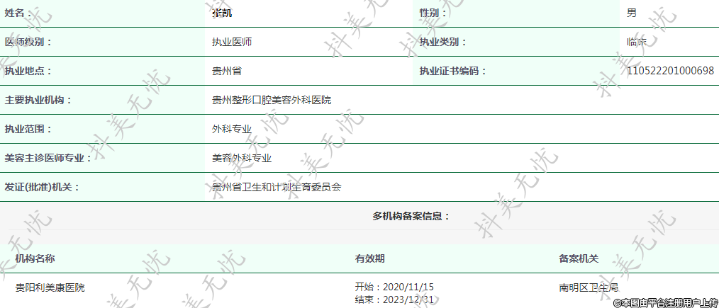 主要执业机构:贵州整形口腔美容外科医院